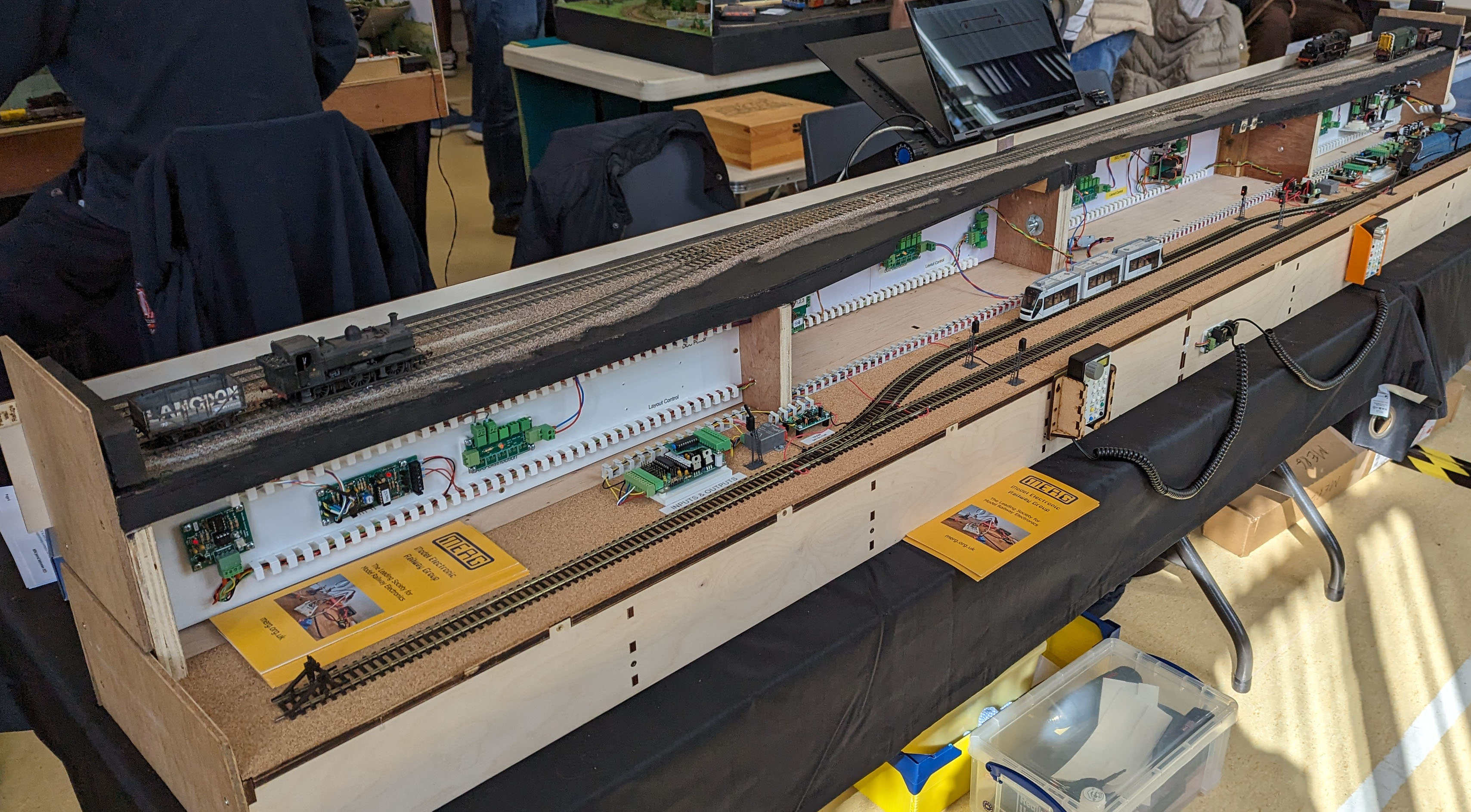 Last year, a local model railway club asked us to provide a MERG presence at their annual exhibition. It wasn’t a great success as we did not have much to show. After that we decided to make simple demonstration layout to showcase MERG kits. We all contributed time and equipment, and put together a double decker layout with all the electronics mounted on top of the baseboards.